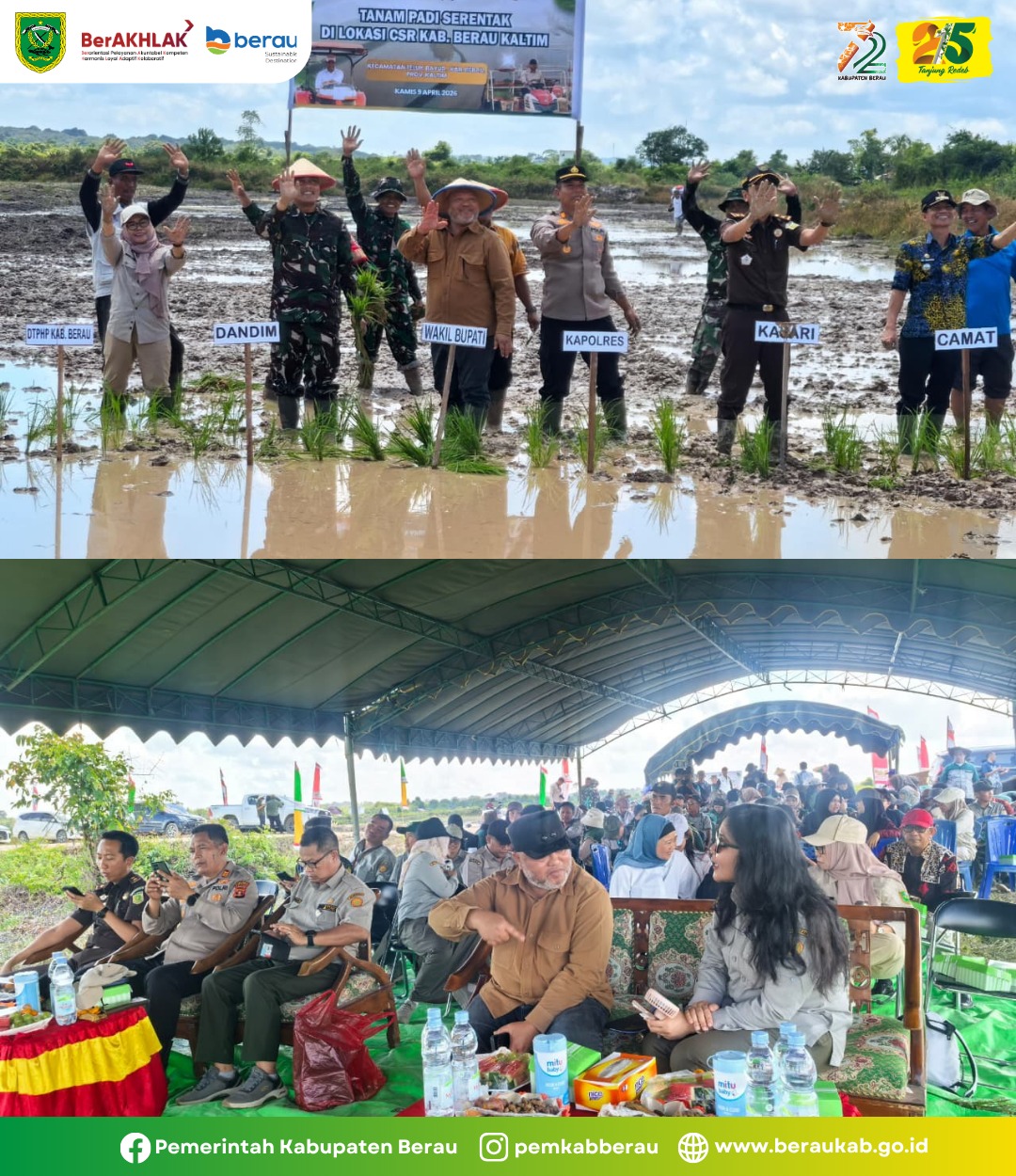 Mewakili Bupati Berau, Wakil Bupati (Wabup), H Gamalis menghadiri Penanaman padi serentak di lokasi Corporate Social Responsibility (CSR) di Kampung Labanan Jaya, Kecamatan Teluk Bayur, pada Kamis (9/4/2026).