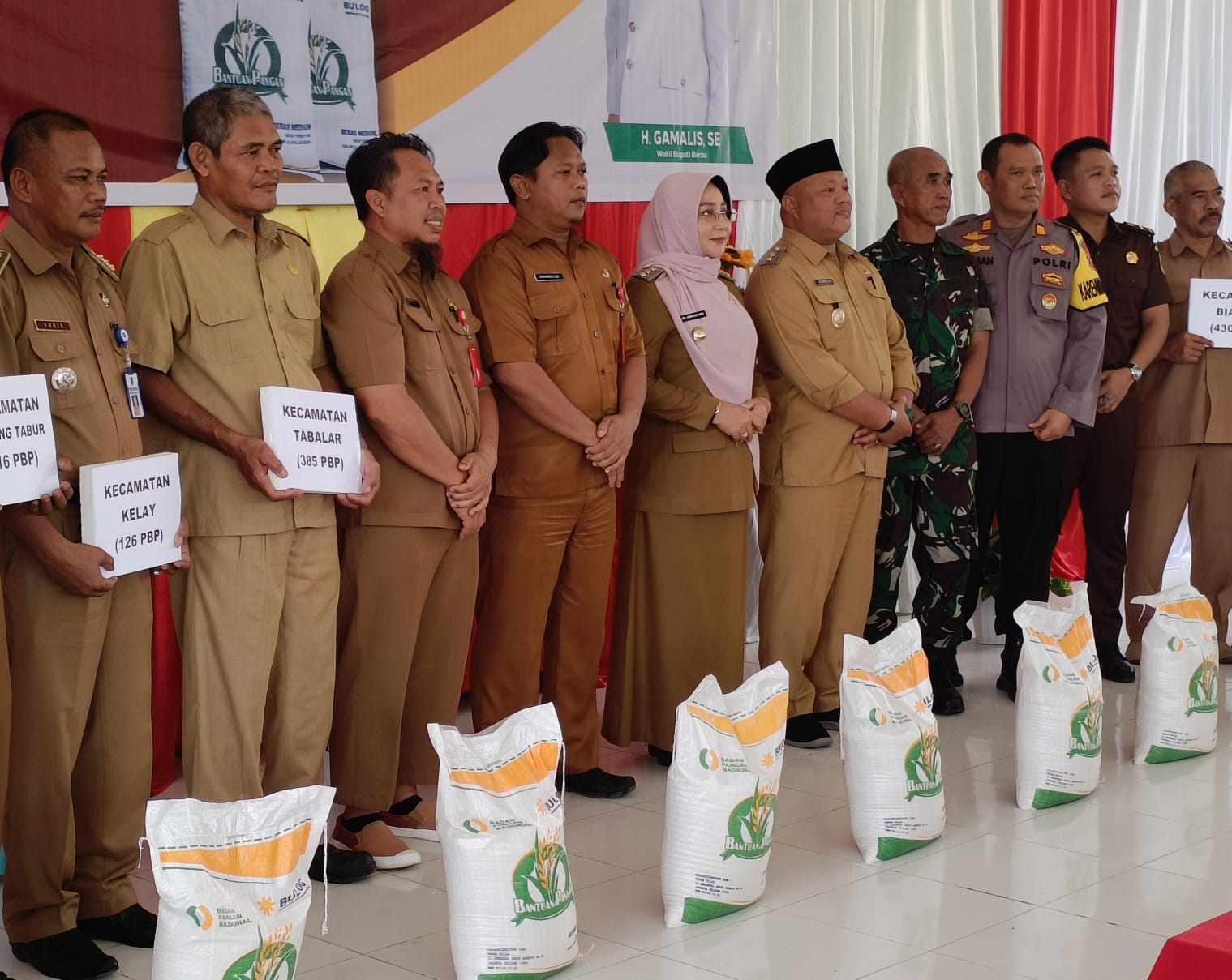 Bupati Berau Hj. Sri Juniarsih MAS didampingi Wakil Bupati Berau H. Gamalis, SE dan Sekda M. Said, SH, MH melaunching penyaluran bantuan pangan cadangan beras pemerintah yg dipercayakan kepada Bulog bekerjasama dgn pemkab Berau dan Kantor Pos Teluk Bayur.